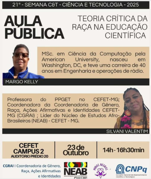 Já no campus Nova Gameleira, acontece a aula pública “Teoria Crítica da Raça na Educação Científica”. A atividade será na quinta-feira (23), das 14h às 16h30 no auditório do prédio 20, e busca trazer um diálogo potente sobre ciência, educação e equidade racial. A aula será ministrada por Margo Kelly, mestre em Ciência da Computação pela American University e por Silvani Valentim, professora do CEFET-MG e coordenadora do CGRAI.